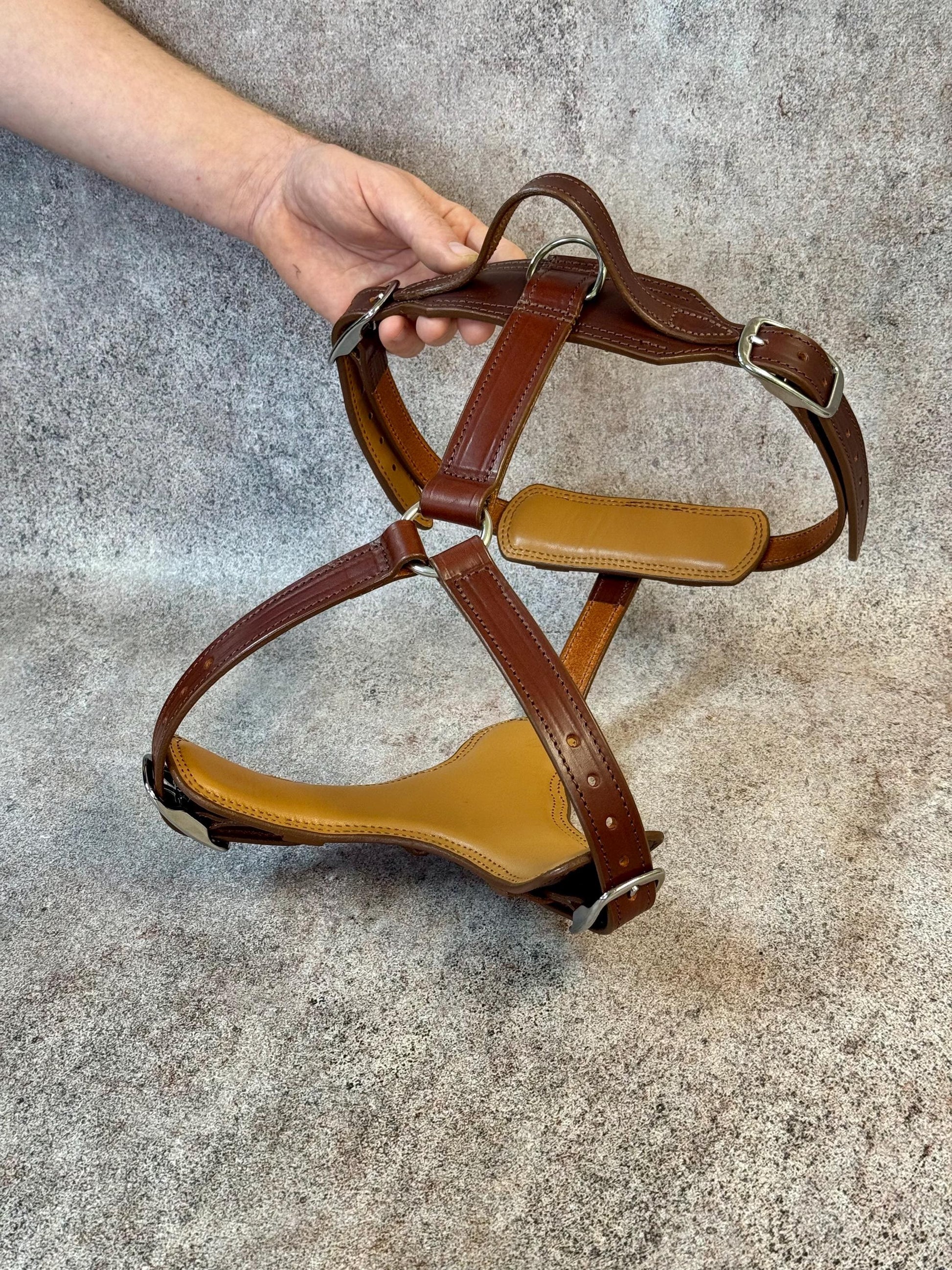 This adjustable no pull leather dog harness is built for everyday walks, training and city or off-road adventures. Multiple buckle points help you customize the fit for your dog’s body, turning it into a customized no pull dog harness that gives you control without discomfort. You can pair it with your favorite leash or order a matching leather dog harness and leash set from our shop.