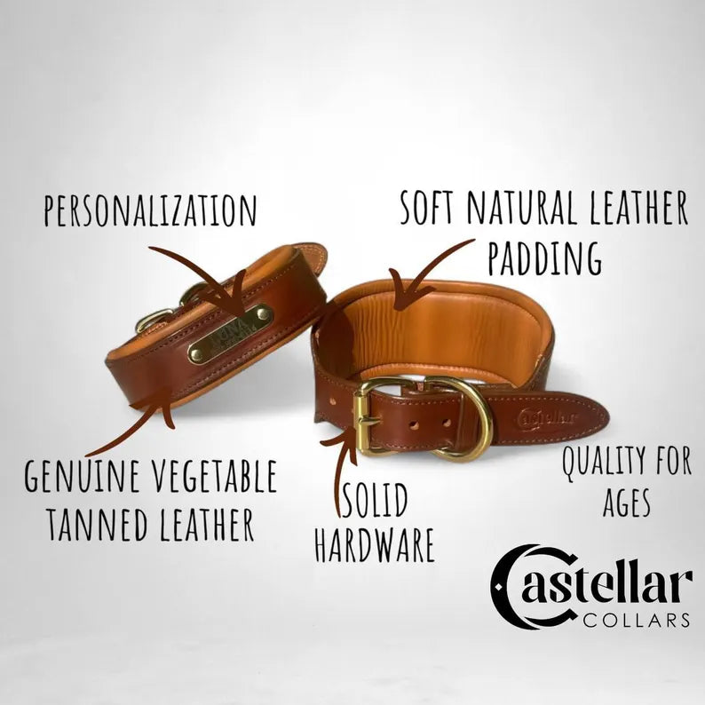 Designed for powerful large breeds such as Cane Corso, Mastiff, Doberman, Retriever and Great Dane, this collar combines style and strength. Solid brass buckle and D-ring keep your dog secure, while the quality craftsmanship is made to handle even very active dogs.
