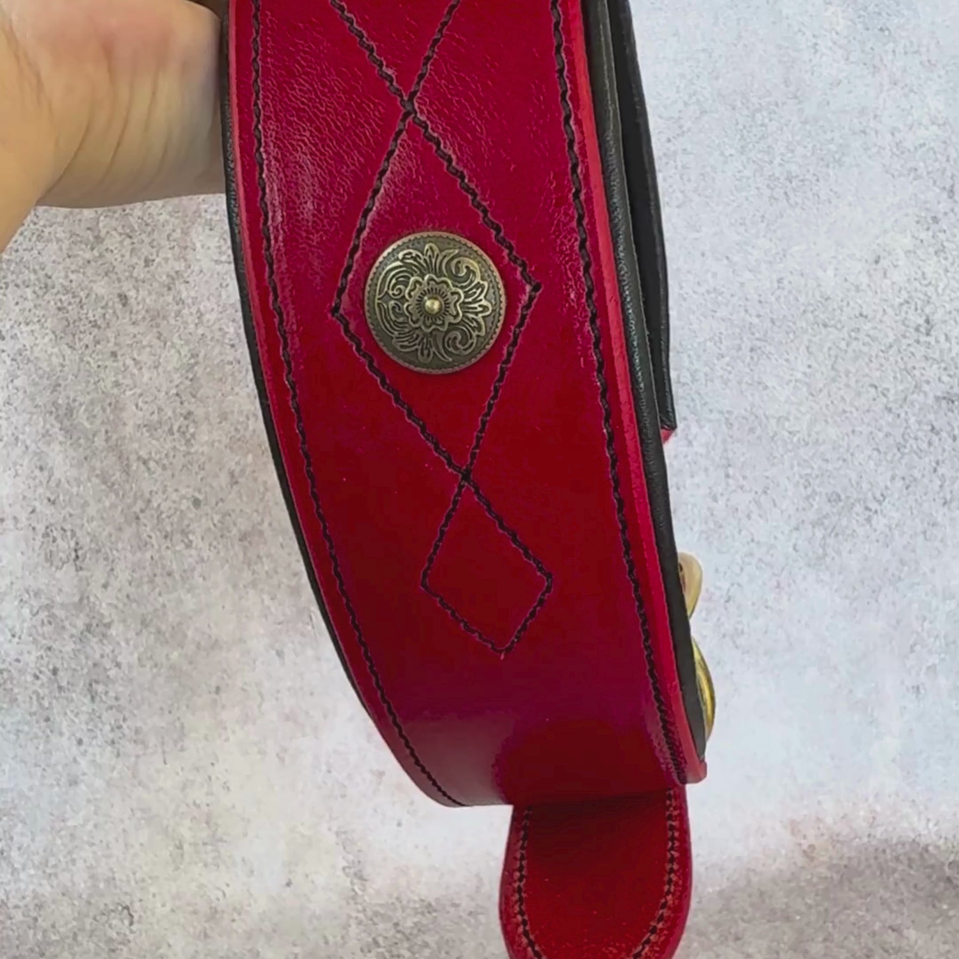 Deep red leather, quilted stitching and brass medallions create a bold, regal look that makes your dog stand out on walks, photo shoots and shows.